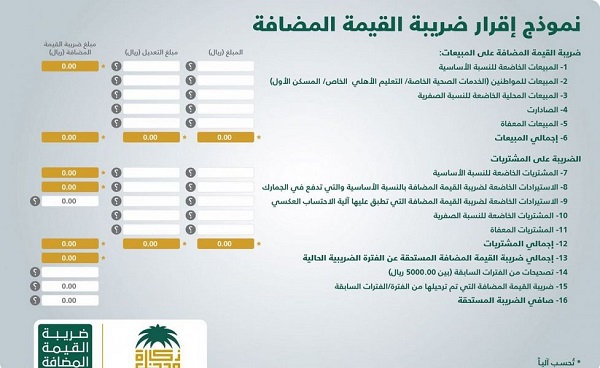 وحثت الهيئة المنشآت على الالتزام بنموذج الإقرار الضريبي الصادر من الهيئة لتقديم معلومات واضحة حول الضريبة المستحقة على التوريدات والضريبة المستحقة على المشتريات، وينقسم نموذج الإقرار الضريبي إلى قسمين منفصلين، الأول يتناول الضريبة على التوريدات (ضريبة المخرجات) والثاني يتناول الضريبة على المشتريات (ضريبة المدخلات).