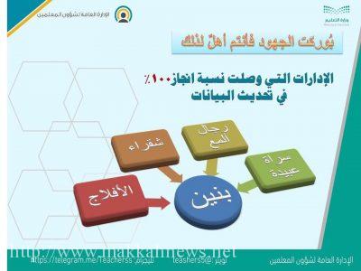 أعلنت الإدارة العامة لشؤون المعلمين بـوزارة التعليم عن الإدارات التي وصلت نسبة الإنجاز 100% في تحديث البيانات لشاغلي الوظائف التعليمية في نظام نور على مستوى المملكة ، ومن بينها إدارة تعليم شقراء (بنين – بنات) حيث حققت هذه النسبة بجدارة ، وبهذه المناسبة توجه سعادة مدير تعليم شقراء الدكتور خالد الشبانة شكره لجميع العاملين على هذا المنجز الذي يضاف لمنجزات الإدارة.
