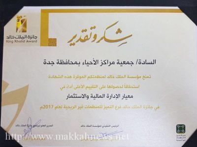 حصلت جمعية مراكز الأحياء بجدة على شهادة الاستحقاق على التقييم الأعلى أداءً في معيار الإدارة المالية والاستثمار من جائزة الملك خالد لفرع التميز للمنظمات غير الربحية لعام 2017 م .