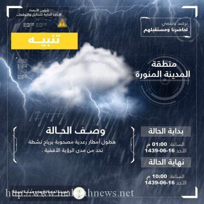 أشارت هيئة الأرصار وحماية البيئة عبر حسابها الخاص في تويتر إلى التنبيه بهطول أمطار رعدية على منطقة المدينة المنورة مصحوبة برياح نشطة تحد من مدى الرؤية الأفقية اليوم الأحد١٦جماد الآخرة .
