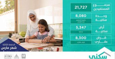 أطلقت وزارة الإسكان وصندوق التنمية العقارية الدفعة الثالثة من برنامج “سكني” لعام 2018م، بإجمالي يصل إلى 21727 منتجاً سكنياً وتمويلياً، تتوزع على جميع مناطق المملكة، ضمن مستهدفات البرنامج خلال العام الجاري والبالغة 300 ألف، ليصبح مجموع ما تم تخصيصه خلال الأشهر الثلاثة الأولى 61722 منتجاً سكنياً وتمويلياً.