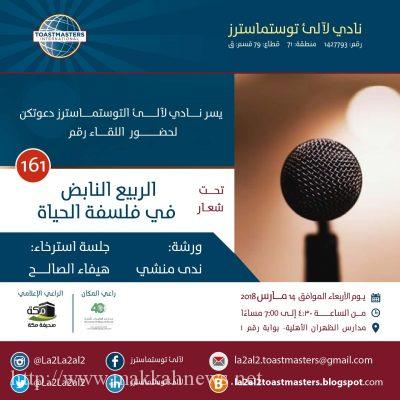 في لقاء إتسم بالتميز وأمتلأ بالعلم والمعرفة , توج نادي لآليء توستماسترز بالخبر خطيباته المفوهات يوم أمس الأربعاء ، حيث فازت بأفضل خطيبة للخطب المعدة التوستماسترز سبأ الجماعي ، كما حصدت الزائرة لمياء الجعفري افضل خطيبة في الخطب الارتجالية، وأخيراً توجت التوستماسترز شيخة الثويني كأفضل مقيمة خطبة للخطب المعدة. جاء هذا باللقاء 161 الذي حمل شعار ( الربيع النابض في فلسفة الحياة ) والذي عقد بمقر مدارس الظهران الأهلية ، حيث افتتح الاجتماع بكلمة امينة السر ت.م ” مي عبدالقادر والتي قدمت فيها نائبة الرئيس للشؤون التعليمية لتلقي كلمة نيابة عن رئيسة النادي ت.م ” عنان سالم ” حيث رحبت بالحضور والضيفات