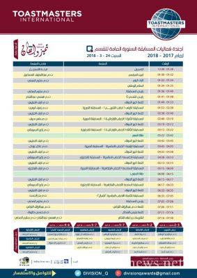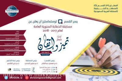 ستنطلق مساء السبت القادم الموافق الرابع والعشرين من مارس الحالي فعاليات مسابقة الخطابة السنوية للقسم ( Q ) للعام 2017 – 2018 م ، والتي ستشهد تنافساَ قوياً بين المشاركين من فئات الخطب المختلفة بقيادة رئيس المسابقة ت.م سليم المدني , ورئيس المحكمين ت.م نذير القاسم .
