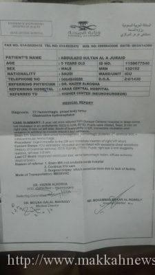 وقال والد الطفل، “ابني مريض بحاجة لعلاج خارج المملكة معه عدة جلطات بالرأس ونزيف وورم، وأتمنى من خادم الحرمين الشريفين الملك سلمان بن عبدالعزيز وولي العهد الأمير محمد بن سلمان حفظهما الله مساعدتي في علاج ابني خارج المملكة”.