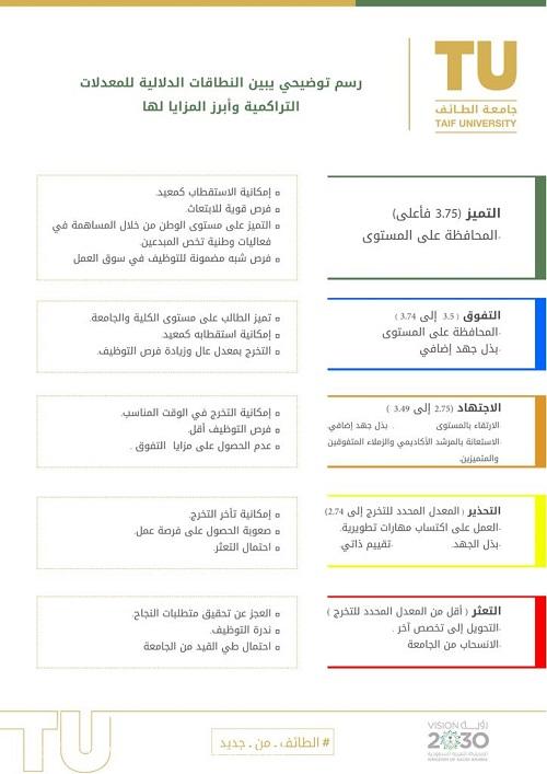 من جانبه, أفاد عميد القبول والتسجيل في جامعة الطائف الدكتور وصل الله بن عبدالله السواط، أن المبادرة تتكون من خمسة نطاقات دلالية وفق معيار المعدل التراكمي للطالب والحد الأدنى للتخرج وهي: نطاق التميز، ثم التفوق، ثم الاجتهاد، ثم التحذير، وأخيراً التعثر، مشيراً إلى أن هذه النطاقات تتدرج من نطاق التميز في القمة للطلبة الذين تتراوح معدلاتهم بين 3.75 إلى 4، ثم نطاق التفوق للطلبة الذين تتراوح معدلاتهم بين 3.50 إلى 3.74، ثم نطاق الاجتهاد للطلبة الذين تتراوح معدلاتهم بين 2.75 إلى 3.49 , يليه نطاق التحذير للطلبة الذين تتراوح معدلاتهم بين “المعدل المحدد للتخرج في الكلية إلى 2.74″، وأخيراً يأتي نطاق التعثر، الخاص بالطلبة الذين تقل معدلاتهم عن معدلات التخرج المحددة في الكلية.