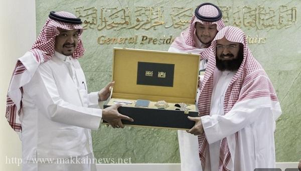 وفي ختام اللقاء, الشيخ السديس, درعاً تكريمياً بهذه المناسبة, لمعالي وزير الحج والعمرة .