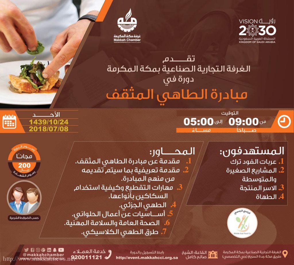 أعلنت الغرفة التجارية والصناعية بمكة المكرمة، عن تنظيم دورة في مبادرة لأصحاب المشاريع الصغيرة والمتوسطة والفود ترك.