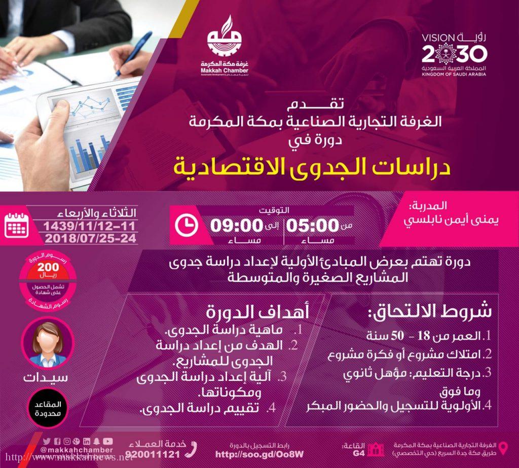 تنظم الغرفة التجارية والصناعية بمكة المكرمة، دورة تدريبية في دراسات الجدوى الاقتصادية، والتي تهتم بعرض المبادئ الأولية لإعداد دراسة جدوى المشاريع الصغيرة والمتوسطة.
