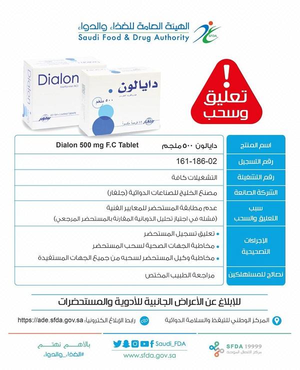 كما تضمنت القرارات سحب جميع التشغيلات من مستحضر (Dialon 500 mg F.C Tablet) برقم تسجيل (161-186-02) الذي ينتجه مصنع الخليج للصناعات الدوائية (جلفار)، بسبب عدم مطابقة المستحضر للمعايير الفنية (فشله في اجتياز تحليل الذوبانية المقارنة بالمستحضر المرجعي).