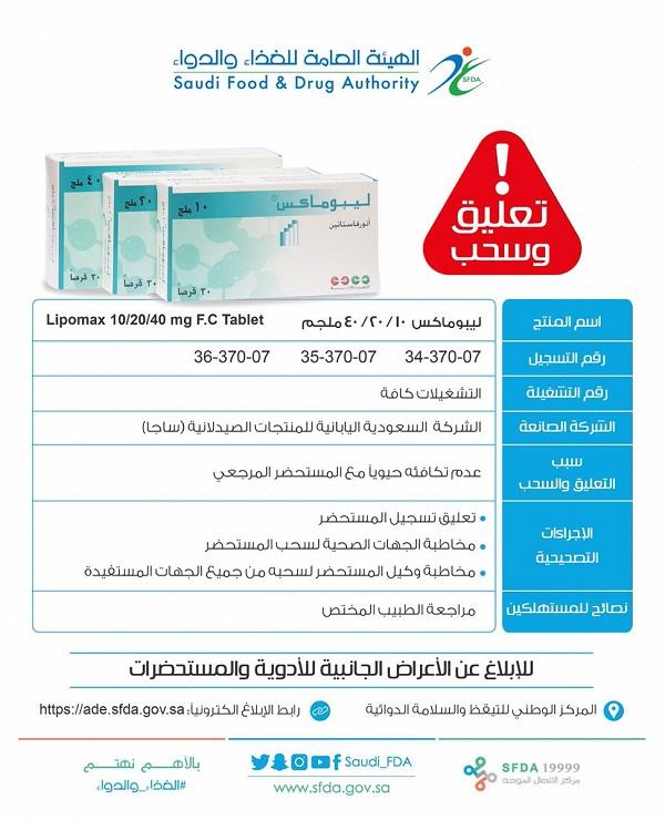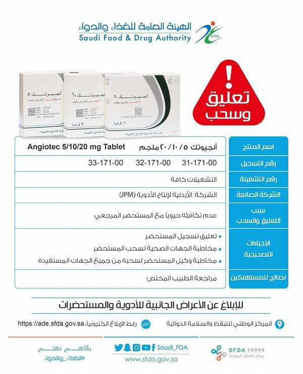 وأوضحت “الغذاء والدواء” أن لجنة تسجيل شركات ومصانع الأدوية ومنتجاتها اتخذت قرارات بخصوص سحب وتعليق وإلغاء عدد من المستحضرات، شملت سحب وتعليق تسجيل جميع التشغيلات من مستحضر Angiotec 5 mg Tablet برقم تسجيل (31-171-00) و Angiotec 10 mg Tablet برقم تسجيل (32-171-00) و (Angiotec 20 mg Tablet) برقم تسجيل (33-171-00) وتنتجها الشركة الأردنية لإنتاج الأدوية (JPM)، وكذلك جميع التشغيلات من مستحضر (Lipomax 40 mg F.C Tablet) برقم تسجيل (36-370-07) و (Lipomax 20 mg F.C Tablet) برقم تسجيل (35-370-07) و ( Lipomax 10 mg F.C Tablet) برقم تسجيل (34-370-07) وتنتجها الشركة السعودية اليابانية للمنتجات الصيدلانية (ساجا)، وذلك لعدم تكافئه حيوياً مع المستحضر المرجعي.