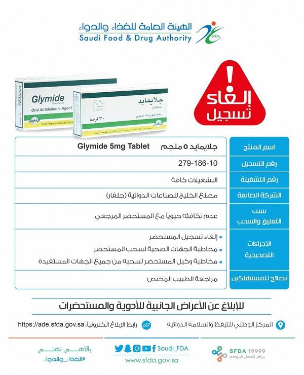 وإضافة إلى ذلك، ألغت الهيئة تسجيل المستحضر (Glymide 5 mg Tablet) الذي يحمل رقم التسجيل (279-186-10)، وينتجه مصنع الخليج للصناعات الدوائية (جلفار) الذي سبق سحبه وتعليق تسجيله بناءً على قرار اللجنة الصادر بتاريخ 25 / 10 / 1439هـ.