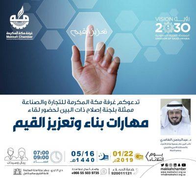 وتنظم لجنة إصلاح ذات البين في الغرفة التجارية، لقاء بعنوان “مهارات بناء وتعزيز القيم” وذلك يوم الثلاثاء الموافق 22/1/2019.