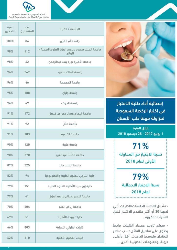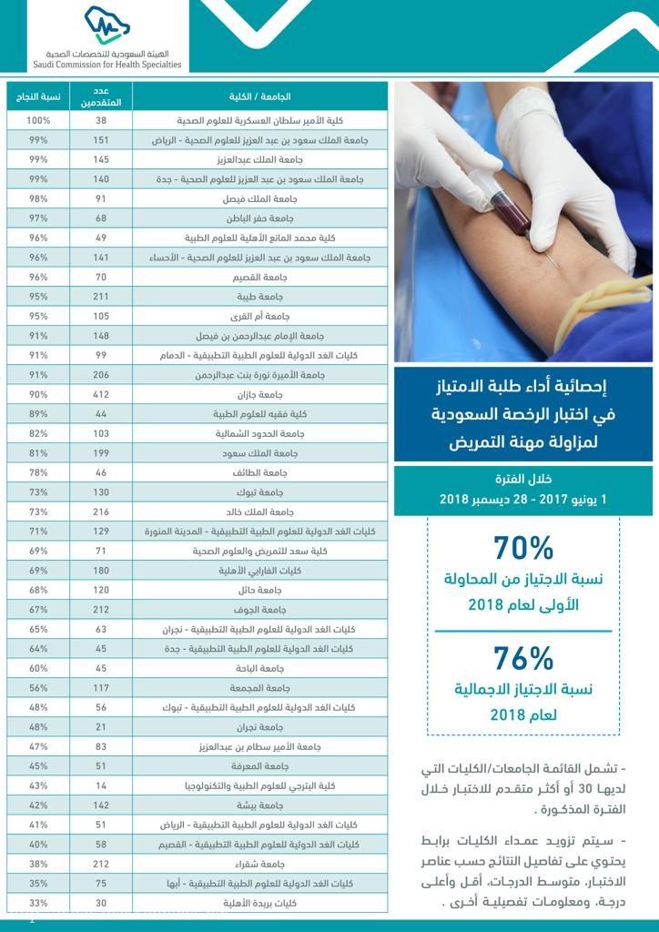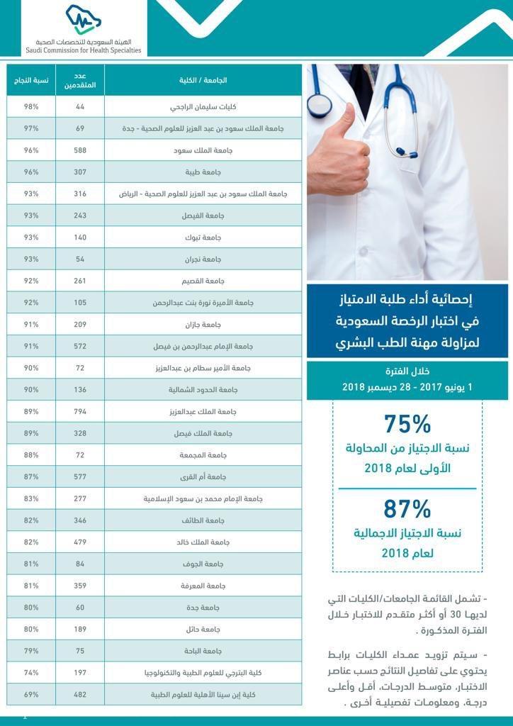 أعلنت الهيئة السعودية للتخصصات الصحية، ارتفاع نسب النجاح في اختبار الرخصة السعودية لأطباء الامتياز في الجامعات السعودية الحكومية والخاصة، وذلك في تخصصات: الطب البشري، وطب الأسنان، والتمريض بين عامي 2017 و 2018م.
