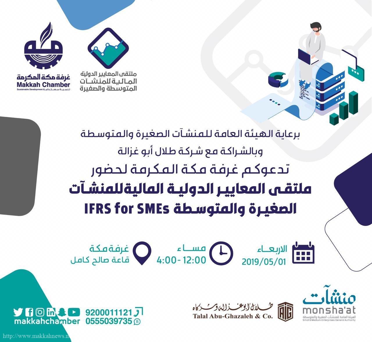 تنظم الغرفة التجارية والصناعية بمكة المكرمة، ملتقى المعايير الدولية المالية للمنشآت الصغيرة والمتوسطة “IFRS for SMEs” برعاية الهيئة العامة للمنشآت الصغيرة والمتوسطة وبالشراكة مع شركة طلال أبو غزالة.