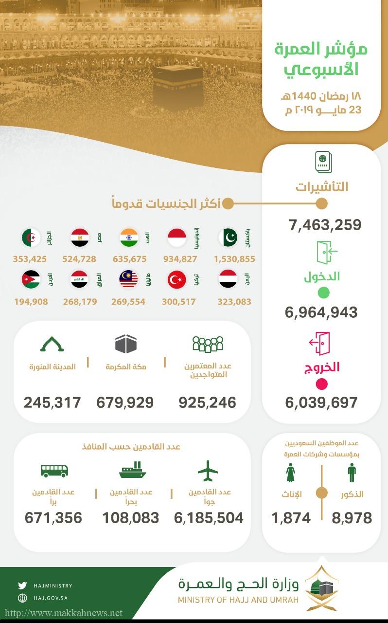 سجلت الإحصاءات التراكمية لمؤشر العمرة الأسبوعي، إصدار 7,463,259 تأشيرة حتى تاريخ 18 رمضان لهذا العام، وجاء مجموع القادمين إلى المملكة 6,964,943 معتمرًا، في حين بلغ عدد المعتمرين المتواجدين داخل المملكة 925,246 معتمرًا، منهم 679,929 في مكة المكرمة، بينما يتواجد 245,317 في المدينة المنورة، فيما سجلت مغادرة 6,039,697 معتمرًا بعد أن أدّوا العمرة والزيارة