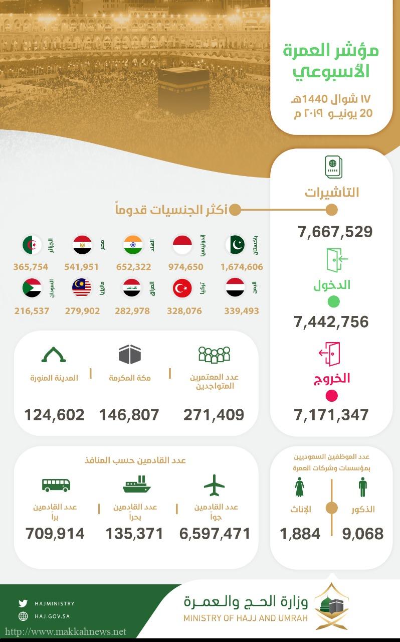 سجلت الإحصاءات التراكمية لمؤشر العمرة الأسبوعي، إصدار 7,667,529 تأشيرة حتى تاريخ 17 شوال لهذا العام، وجاء مجموع القادمين إلى المملكة 7,442,756 معتمرًا، في حين بلغ عدد المعتمرين المتواجدين داخل المملكة 271,409 معتمرًا، منهم 146,807 في مكة المكرمة، بينما يتواجد 124,602 في المدينة المنورة، فيما سجلت مغادرة 7,171,347 معتمرًا بعد أن أدّوا العمرة والزيارة.