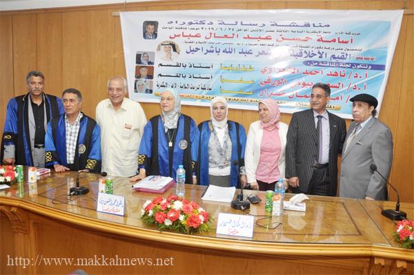 شهدت كلية الآداب بجامعة الأسكندرية مناقشة رسالة الباحث أسامة حسن عبدالعال عباس للحصول على درجة دكتوراه الفلسفة في الاداب من قسم اللغة العربي وأدابها تخصص الدراسات الأدبية والنقدية، يوم الاثنين 24 / 6 /2019 م بقاعة الندوات والمؤتمرات بالكلية ، وكان عنوان موضوع الرسالة (القيم الأخلاقية في شعر عبدالله باشراحيل) وتكونت لجنة مناقشة الرسالة من كل من الأستاذة الدكتورة ناهد أحمد الشعرواي مشرفاً ورئيساً وأستاذ بقسم اللغة العربية بكلية الأداب جامعة الأسكندرية والأستاذ الدكتور السعيد بيومي الورقي عضوا ، الأستاذ بقسم اللغة العربية كلية الأداب جامعة الأسكندرية ، والأستاذةالدكتورة آمال كمال ضرار عضواً ، الأستاذ بكلية الدراسات الأسلامية بجامعة الأزهر بالأسكندرية .