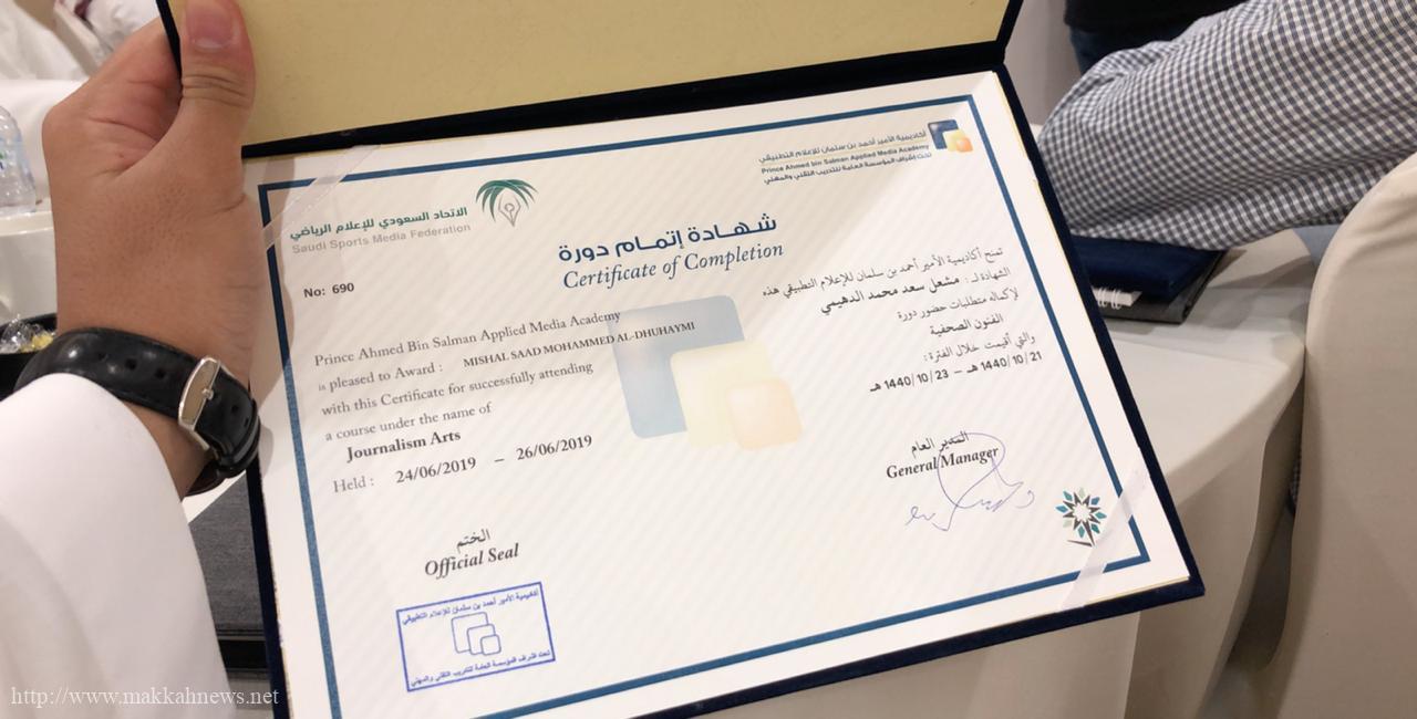 وقد تسلم الزميل مشعل شهادة الدورة من أمين عام هيئة الصحفيين السعودين الدكتور عبدالله الجحلان .