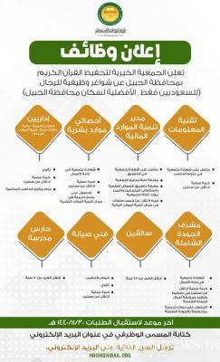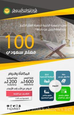 اعلنت الجمعية الخيرية لتحفيظ القرآن بمحافظة الجبيل عن توفر وظائف شاغرة بعدد (100) معلم سعودي لتعليم القرآن الكريم بالتسجيل عبر الرابط http://cutt.us/qurant , بشرط أن لا يقل المؤهل العلمي عن ثانوي- اتقان تلاوة القرآن الكريم- إجتياز المقابلة الشخصية-حضور برنامج تأهيل المعلمين . كما أعلنت عن عدة وظائف تخصص(تقنية المعلومات-مدير تنمية الموارد المالية-اخصائي موارد بشرية-مشرف الجودة الشاملة-فني صيانة الحاسب الآلي-اداريين في مجال العلاقات العامة-تنمية الموارد المالية-المالية-الجودة), وكذلك وظائف سائقين وحراس مدارس.
