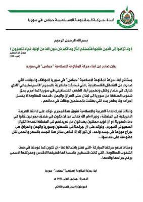 أعرب فصيل من حركة المقاومة الإسلامية حماس في سوريا عن استياء أبناء الحركة في سوريا من مشاركة وفد بقيادة اسماعيل هنية في الصلاة على الهالك قاسم سليماني، وقال بيان للحركة : أبناء حركة المقاومة الإسلامية حماس في سوريا