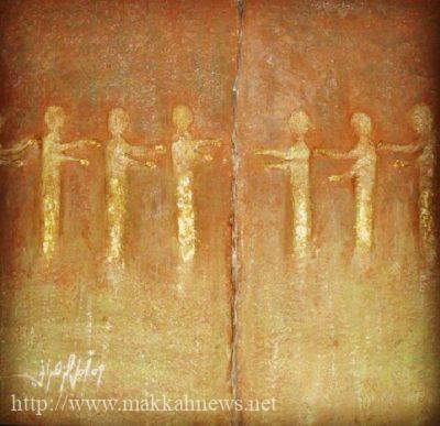 عبارة عن الجدار الفاصل في فلسطين الذي قام ببنائه  الإسرائيليون حيث فصل الشعب عن بعضه و الأسر عن بعضها فهم بإيمانهم وقوتهم وتكاتفهم صامدون كل منهم واضع يده على كتف الآخر لكي لا يضعف أحد منهم وهنا رمزت للصمود بورق الذهب على أطراف أيديهم و أرجلهم فهم يدا بيد وارجلهم كالوتد فهم صامدون