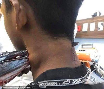 قفزت سمكة من الماء واخترقت رقبة شاب إندونيسي؛ حيث رشقت فكيها الطويلين الحادين في عنقه، بينما كان يصطادفي جنوب إندونيسيا.