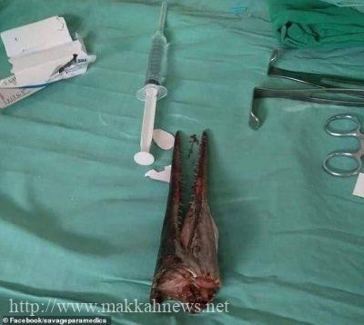 وأظهرت صور فم سمكة الفصيلة الخرمية، وهي تخترق رقبة الشاب من جهة، لتخرج من الجهة الأخرى للرقبة، وظلتالسمكة عالقة في جسمه، حتى تمت إزالتها في المستشفى.