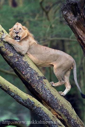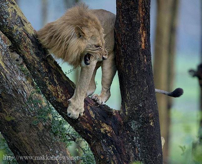 وعملًا بمبدأ “الهروب ثلثي الرجولة”، لم يجد الأسد بدًا من الهروب من قطيع الجاموس الغاضب في متنزه بحيرة ناكورو الوطني في كينيا، إلا أن يتسلق الشجرة قبل أن يطيحوا به.