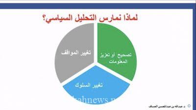 وأكد الدكتور العساف، أن التحليل السياسي هو عملية البحث في الاحتمالات الممكنة لمسارات التفاعلات بين القوى السياسية في العالم، من خلال منهج علمي تساعدفي الحكم على الظواهر والأحداث السياسية محليًا وإقليميًا وعالميًا ، ولذلك فهو يحتاج إلى فهم الواقع السياسي وعلاقة هذا الواقع السياسي بالسياسية الدولية.
