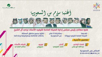 في تعاون فني ضخم بين “الهيئة العامة للترفيه” وشركة “روتانا للصوتيات والمرئيات”، أطلقت يوم السادس من يونيو الجاري أغنية “سلام من السعودية” بمشاركة مجموعة من أكبر وأهم المطربين السعوديين، وهي من فكرة معالي رئيس مجلس إدارة الهيئة العامة للترفيه تركي بن عبد المحسن آل الشيخ، الذي تابع جميع مراحل إنتاجها، ووقف على جميع تفاصيلها.