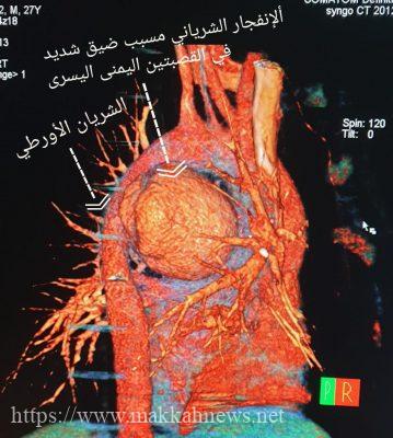 و أوضح رئيس وحده جراحة الأوعية الدموية و التداخلية الدكتور محمد القرني بأنه بعد الاطلاع على التاريخ المرضي تبين معانات المريض مع البلع قد امتدت على مدار ٣٠ يوم إلى أن تطورت و بشكل مفاجئ بألم حاد في الصدر مع صعوبة في التنفس و عدم القدرة على بلع الماء مع نوبات لفقدان الوعي. حينها قام بمراجعة احد مستشفيات مدينة جدة الحكومية ومن ثم قبول الحالة بشكل عاجل بالمدينة الطبية. تم اخضاع المريض لعدد من الفحوصات والاشعات اللازمة والتي أظهرت نتائجها وجود تسرب دموي حاد في جدار الشريان الأبهر مع تكون كتله دموية ضاغطه على القلب و القصبات الهوائية و كذلك مجرى الطعام.
