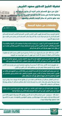 اكد امام وخطيب المسجد الحرام ، الشيخ الدكتور سعود بن ابراهيم الشريم ، في خطبة اليوم الجمعة ١٤٤/٢/٢٢ ، ” إن من حق المسلم على أخيه أن يكون سلما له ، وعضوا فاعلا في جسد الأمة الواحد الذي إذا اشتكى منه عضو تداعى له سائر الجسد بالحمى والسهر” وان كف اذى اللسان واليد عن المسلمين ، هو امر واجب على الشخص.وقال في سياق خطبة الجمعة ” ان كل عمل حسي او معنوي يلحق الاذى والضرر بالمسلمين ، ناتج عن اذى القول او فعل اليد “. واشار بان الاذى هو من طباع الافاعي والعقارب ، عافنا الله،