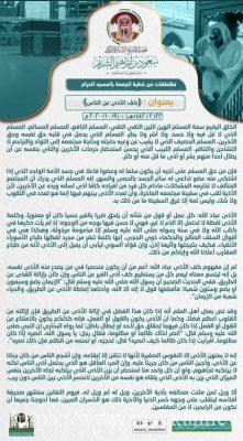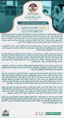 وطالب الدكتور الشريم المصليين ، بعدم اذية الجار او القريب او يجره لغيره. واوضح الدكتور سعود الشريم ، بان هنالك صدقة يقوم بها الانسان عن نفسه، لاتحتاج الى مال او جهد ، وهي كف المرء عن اذية الاخرين. وان تكف شرك عن الناس. محذرا كل الحذر من الايذاء .