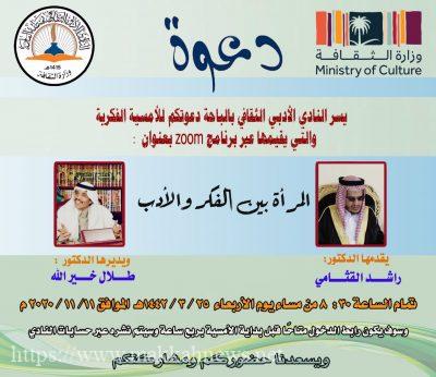 الباحة – ينظم النادي الأدبي الثقافي بمنطقة الباحة أمسية فكرية بعنوان : المرأة بين الفكر والأدب ، يقدمها الدكتور راشد القثامي ويديرها الدكتور طلال خير الله وذلك في تمام الساعة الثامنة والنصف من مساء يوم الأربعاء الموافق 25 من الشهر الجاري عبر خدمة zoom