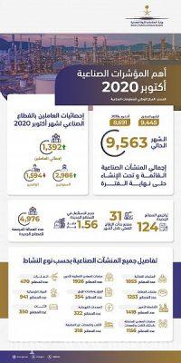 الرياض- كشفت وزارة الصناعة والثروة المعدنية في تقرير مؤشراتها لشهر أكتوبر2020 أن إجمالي عدد المنشآت الصناعية القائمة والتي تحت الإنشاء حتى نهاية شهر أكتوبر الماضي بلغت 9563 منشأة، مقارنة بـ9445 الشهر الماضي، بنسبة نمو تصل إلى 1.3%.