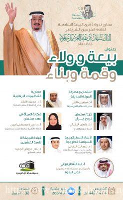 تنظم صحيفة مكة الاليكترونية، يوم الخميس 4 ربيع الثاني 1442هـ، ندوة عن بُعد بعنوان (بيعة وولاء وقمة وبناء)، ويشارك في الندوة كل من الاستاذ الدكتور سهيل قاضي، مدير جامعة أم القرى سابقا، في محور بعنوان (سلمان وعصرنة الدولة الحديثة)، والاستاذ الدكتور محمد العُقلا مدير الجامعة الإسلامية سابقا، في محور بعنوان (محاربة التنظيمات الإرهابية)، والأستاذ دكتور عايض الزهراني،استاذ التاريخ النقدي في محور (حزم سلمان لردع ايران) ، والأستاذ الدكتور، عبدالله الرفاعي، رئيس تحرير مجلة المسلمون و عميد كلية الاعلام بجامعة الإمام سابقًا، في محور (الابعاد الأستراتيجية للسياسة الخارجية)، كما تشارك في الندوة الاستاذة الدكتورة، أميرة مصطفى أمين، استاذة التاريخ بجامعة الملك عبد العزيز، في محور (مكانة المرأة في عهد سلمان)، والدكتور بندر عويض الجعيد، الكاتب الاقتصادي) في محور (قيادة المملكة لقمة العشرين)، تعقد الندوة يوم الخميس المقبل الساعة السابعة والنصف بتوقيت مكة المكرمة. ويديرها الاستاذ عبد الله الزهراني رئيس التحرير.