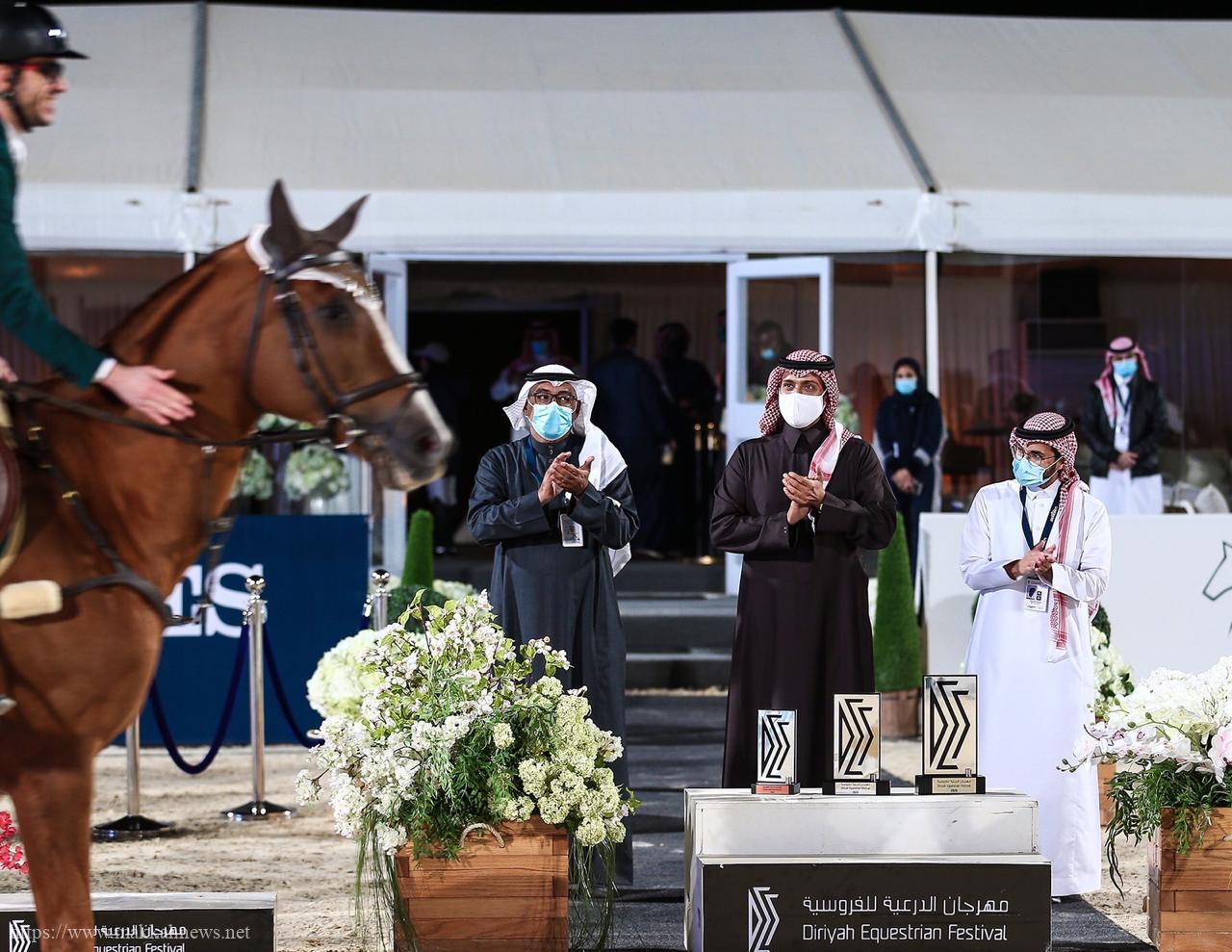 افتتح فرسان المملكة العربية السعودية أولى جوائز مهرجان “الدرعية” للفروسية الذي انطلق مساء أمس ، حيث حصل الفرسان عبد الرحمن المطوع، عبد الله أبا الخيل، والأمير فيصل بن فهد بن مساعد، على المراكز الثلاثة الأولى “تباعاً” في سباق قفز الحواجز “فئة نجمة واحدة” ضمن فعاليات المهرجان والتي يحتضنها مركز الدهامي في الدرعية، وينظمها الاتحاد السعودي للفروسية بمشاركة 118 فارس وفارسة من أكثر من 30 دولة في العالم وتستمر حتى يوم السبت القادم ، وتوج الفارس المطوع بزمن (29.19 ثانية) من دون أي خطأ، فيما حصل الفارس أبا الخيل على المركز الثاني (30.73 ثانية) بدون أي خطأ، والثالث الفارس الأمير فيصل بن فهد بن مساعد (31.89 ثانية) بدون أي خطأ ، كما حصل على المركز الرابع الفارسة الهولندية ماندي جوترد بزمن (33.36 ثانية) بدون أي خطأ، والخامس نايف الشواف بزمن (36.30) بدون أي خطأ ، وأبدى الفارس المطوع سعادته بنتائج اليوم الأول، وقال “تميز الفارس السعودي وتألقه أراه طبيعي لأنها أحد أهم رياضاتنا من قديم الزمان، أن تكون بداية النتائج سعودية فهذا حافز لنا في المسابقات المقبلة ومواصلة تحقيق النتائج الكبيرة” ، وأضاف “أُهنئ زملائي على ما حققوا، وأتمنى التوفيق للبقية في تحقيق نتائج كبيرة، وشُكر للقائمين على تنظيم هذا الحدث “.