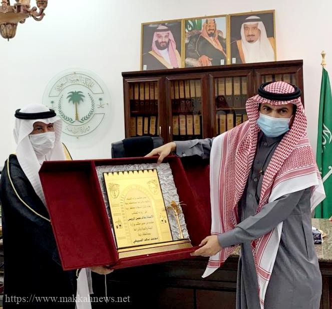 وقام المحافظ خلال الزيارة بجولة على إدارات وأقسام المكتب, واطّلع على الاستعدادات والتجهيزات الفنية والإدارية، واستمع إلى شرح مفصل عن المهام والأعمال التي يقدمها مكتب الوزارة للمستفيدين من أهالي المحافظة والمحافظات المجاورة من مزارعين ومربي ماشية، وملخص لاعمال ومنجزات المكتب خلال العام 2020 م وفي ختام الزياره تم تقديم درع للمحافظ نيابة عن مدير عام فرع وزراة البيئه والمياه والزراعة بمنطقة مكه المكرمه المهندس سعيد بن جارالله الغامدي .