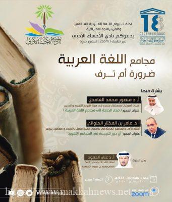الأحساء : احتفاء بيوم اللغة العربية العالمي يقيم نادي الأحساء الأدبي – بمشيئة الله – عند الساعة الثامنة من مساء الأحد الخامس من جمادى الأول الجاري الموافق ٢٠ ديسمبر ٢٠٢٠م ندوة عن ” المجامع اللغوية هل هي ضرورة أم ترف ” ويشارك فيها كل من