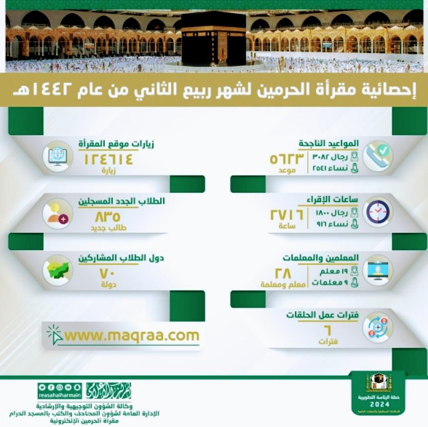 شارك في مقرأة الحرمين الشريفين خلال الشهر الماضي (ربيع الثاني 1442هـ)، حوالي (125) ألف زائر، من (70) دولة.