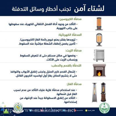 الباحة – حذرت المديرية العامة للدفاع المدني من الأخطار المصاحبة لوسائل التدفئة مثل الحطب والفحم والكيروسين والدفايات الزيتية ودفايات الغاز وأهمية الحرص على التقيّد بتعليمات السلامة واتخاذ التدابير الوقائية اللازمة بشأنها.