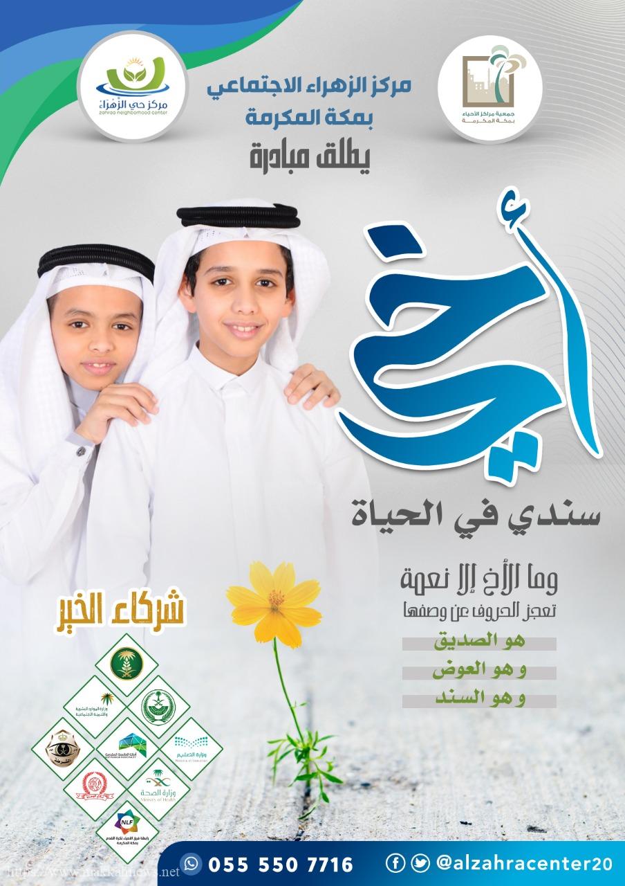 مكة المكرمة : يطلق مركز الزهراء الاجتماعي بمكة المكرمة ضمن سلسلة مبادراته المتميزة “اخي سندي” وتأتي هذه المبادر ة استكمالا لما بدأ به المركز من مبادرات سابقة وهي ” أمي جنتي وبرنامج أبي ريحانة الحياة ثم برنامج أختي شذى روحي “ جميعها تعزز تماسك الاسرة ومن ثم بيتنا الكبير بوطننا المعطاء  وسوف تطلق المبادرة في عدة مواقع وجهات ومن ضمنها التعليم العام ممثلاً بتعليم مكة المكرمة (بنين وبنات ) ضمن الشراكة المجتمعية وعدد من الشراكات الرياضية وفرق الأحياء ووحدات التطوع في الدوائر الحكومية والأهلية والخاصة وفي الأسواق.