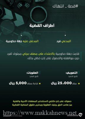 قررت الهيئة السعودية للملكية الفكرية توقيع غرامة مالية بقيمة 5000 ريال، بالإضافة إلى تعويض مالي بقيمة 25000 ريال ضد جهة حكومية بعد ثبوت قيام هذه الجهة بالاعتداء على “مصنف مرئي” لفرد دون موافقته والحصول على إذن بذلك.