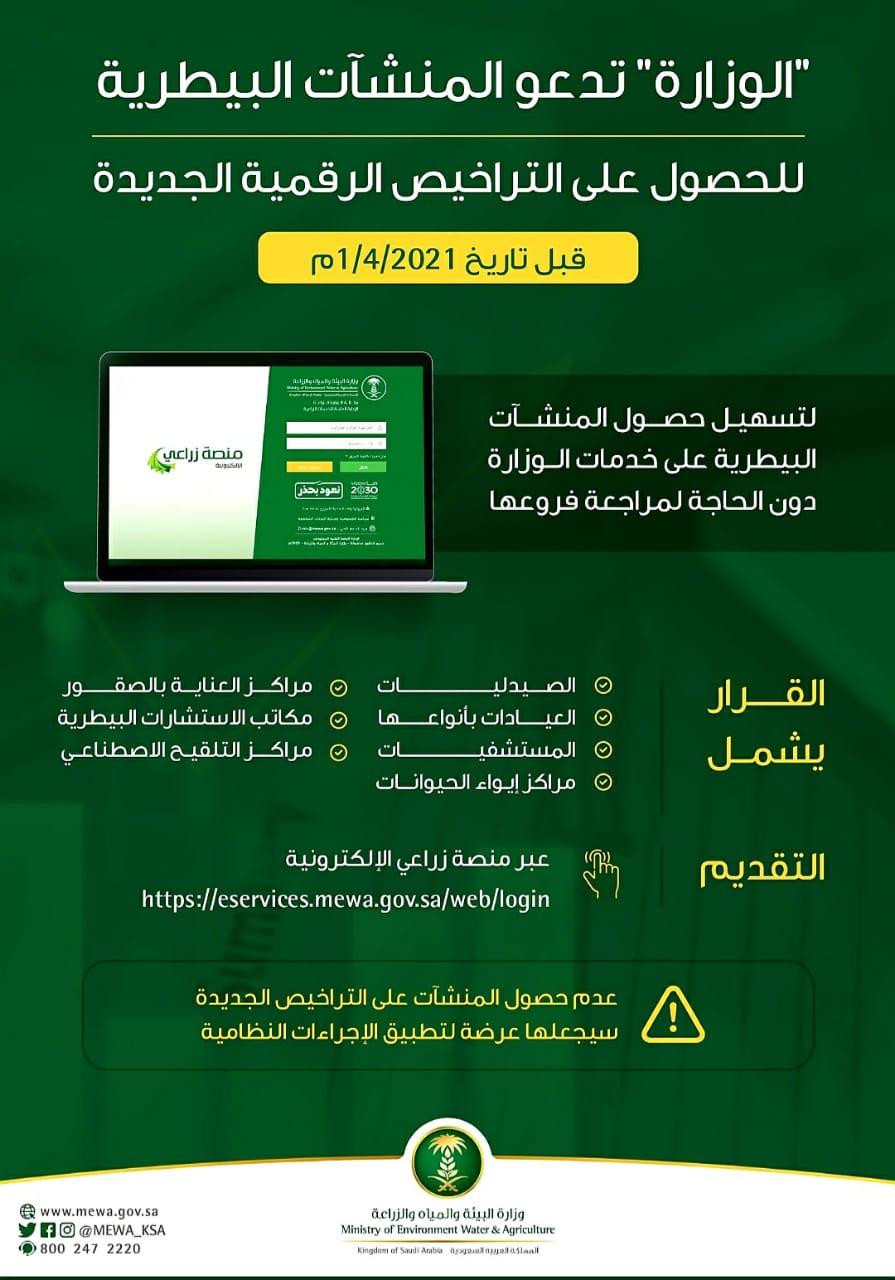 لذلك دعت الوزارة جميع المنشآت البيطرية بالمنطقة إلى سرعة الحصول على التراخيص الرقمية الجديدة قبل تاريخ بداية ابريل للعام الحالي، وذلك عبر منصة زراعي الإلكترونية (https://eservices.mewa.gov.sa/web/login ).
