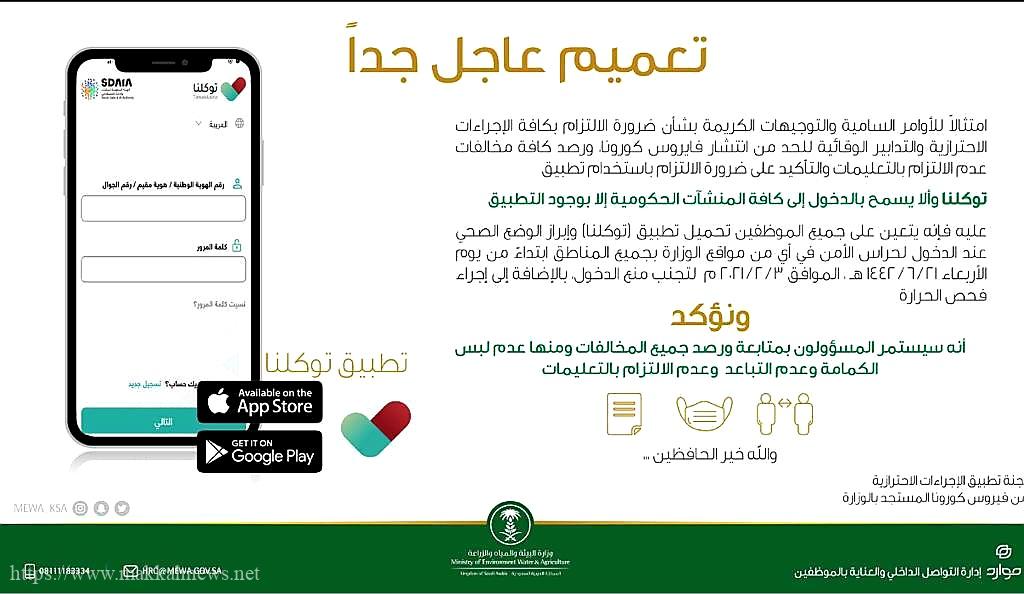 وأكد نائب مدير فرع وزارة البيئة والمياه خلال اجتماع مع منفذين بروتوكولات الوقاية ضرورة العمل على اعداد خطة متكاملة للتأكد من استخدام مراجعي الوزارة لتطبيق “توكلنا”، إضافة إلى التأكد من تطبيق كل الإجراءات الاحترازية عبر تكثيف الجولات الرقابية لمواجهة انتشار الفيروس بين الموظفين ، بالإضافة إلى أن يكون تطبيق “توكلنا ” شرطاً احترازياً إلزاميّا لدخول مقر فرع الوزارة .