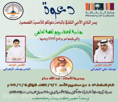 الباحة – يحتفي نادي الباحة الأدبي الثقافي مساء الأحد القادم بيوم القصة العالمي بطريقة مختلفة من خلال مشروع تجسير الإبداع حيث يستضيف أصغر مؤلف في مجال القصة إلياس يوسف ووالده القاص يوسف الزهراني في أمسية قصصية عبر تطبيق الزوم