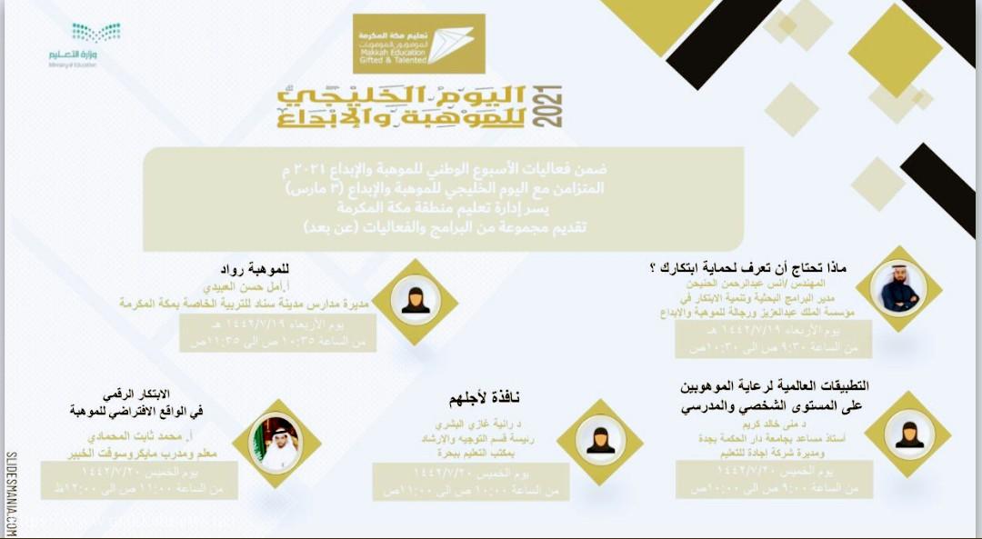 برعاية المدير العام للتعليم مكة المكرمة الدكتور احمد بن محمد الزائدي،  وتزامنًا مع اليوم الخليجي للموهبة والإبداع 2021م، تم اليوم الاحد 1442/7/16 إطلاق  فعاليات الأسبوع الوطني للموهبة والإبداع 1442 هـ وذلك من خلال تقديم برامج وفعاليات متنوعة.
