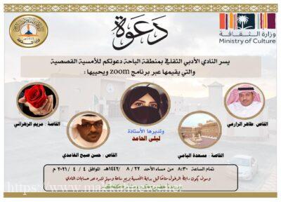 الباحة – يستضيف النادي الأدبي الثقافي بمنطقة الباحة الساعة الثامنة والنصف من مساء الأحد القادم ٢٢-٨-١٤٤٢هـ عبر برنامج zoom عدد من نجوم القصة في امسية قصصية يشارك فيها القاص طاهر الزارعي والقاصة مسعدة اليامي والقاص حسين صبح الغامدي والقاصة مريم الزهراني وتدُير الأمسية الأستاذة ليلى الحامد وسيتم فتح الرابط للخضور قبل الأمسية بربع ساعة .