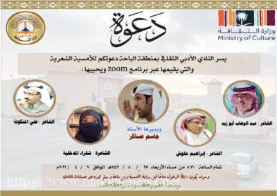 الباحة – يستضيف النادي الأدبي الثقافي بمنطقة الباحة غد الأربعاء ٢٥-٨-١٤٤٢هـ عدد من نجوم الشعر في أمسية شعرية عبر برنامج zoom حيث سيشارك الشاعر عبدالوهاب ابو زيد والشاعر علي المنكوته والشاعر ابراهيم حلوش والشاعرة شقراء المدخلية ويُدير الأمسية الشاعر جاسم عساكر وسيتم بث الأمسية في تمام الساعة الثامنة والنصف مساءً وسيتم يفتح الرابط قبل الأمسية بربع ساعة . وأشار رئيس النادي الأدبي الثقافي بالمنطقة حسن بن محمد الزهراني بأن هذه الأمسية الشعرية التي تضم نخبة من شعراء الوطن تأتي امتداداً لبقية الأمسيات التي يقيمها النادي في سياق الأنشطة المتنوعة إرضاءً لجميع الأذواق والأطياف الثقافية وسيتم حفظها في موقع النادي على اليوتيوب بعد انتهاء الأمسية