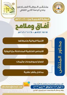 الباحة – تحت رعاية صاحب السمو الملكي الأمير الدكتور حسام بن سعود بن عبدالعزيز أمير منطقة الباحة يطلق نادي الباحة الأدبي الثقافي ملتقاه السادس للرواية العربية تحت عنوان ( الرواية العربية من ٢٠٠٠ – ٢٠٢٠ آفاق وملامح )                    في ١٨ /١١ / ١٤٤٢هـ الموافق ٢٨ /٦ / ٢٠٢١ بمشاركة عربية وعالمية من نقاد ومبدعي الرواية حيث عقدت اللجنة الاستشارية للملتقى بمشاركة :